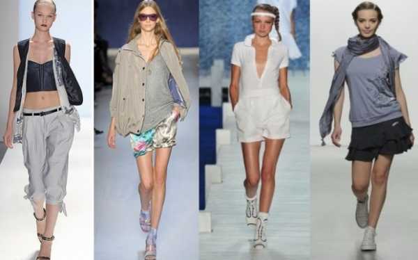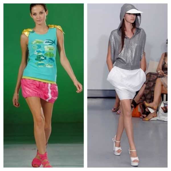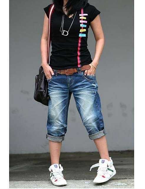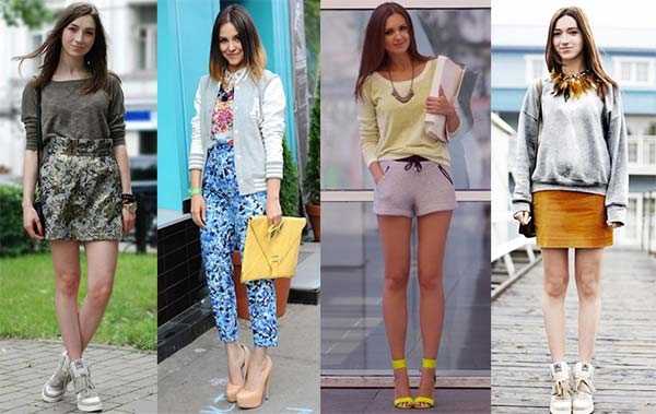 - Леггинсы с лампасами или яркими принтами, а также микрошорты (на фото ниже) — для уверенных в красоте своих ног девушек. Для более скромных — брюки с манжетами, джинсы, брюки-карго.