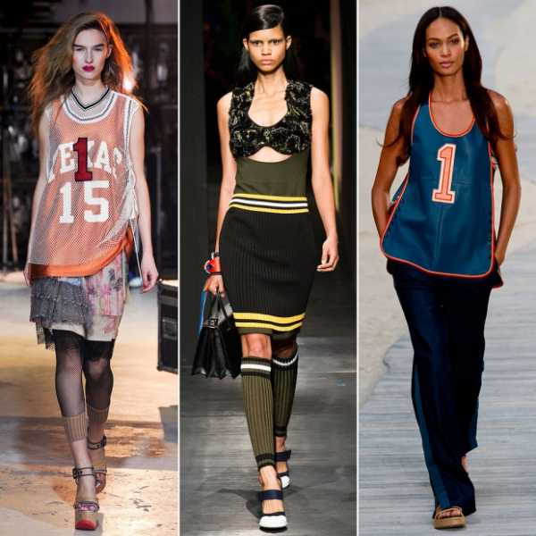 Верх. Если говорить о характерной для спортивного стиля верхней части образа, то сюда относятся однотонные или с наличием всевозможным принтов футболки, водолазки, футболки-поло, футболки-тенниски, свитшоты, тонкие трикотажные джемперы прямого покроя. При этом верх в спортивной стилистике отличается широким многообразием видов горловин: от простой «лодочки» до стойки или гольфа.