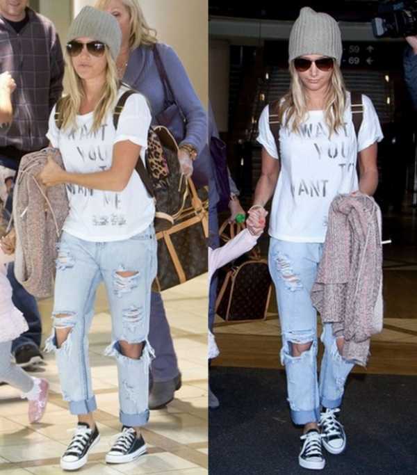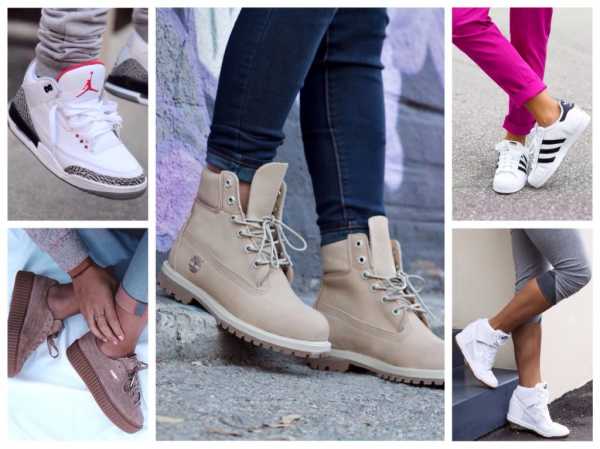 - Выбирайте комфортную обувь актуального дизайна — яркие сникерсы, кеды, кроссовки на платформе, слипоны, топсайдеры. В холодное время года — ботинки в стиле Timberland (такие, как на следующем фото) или высокие кроссовки.