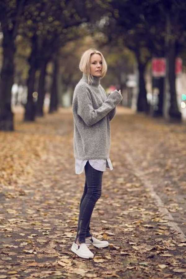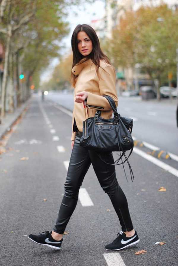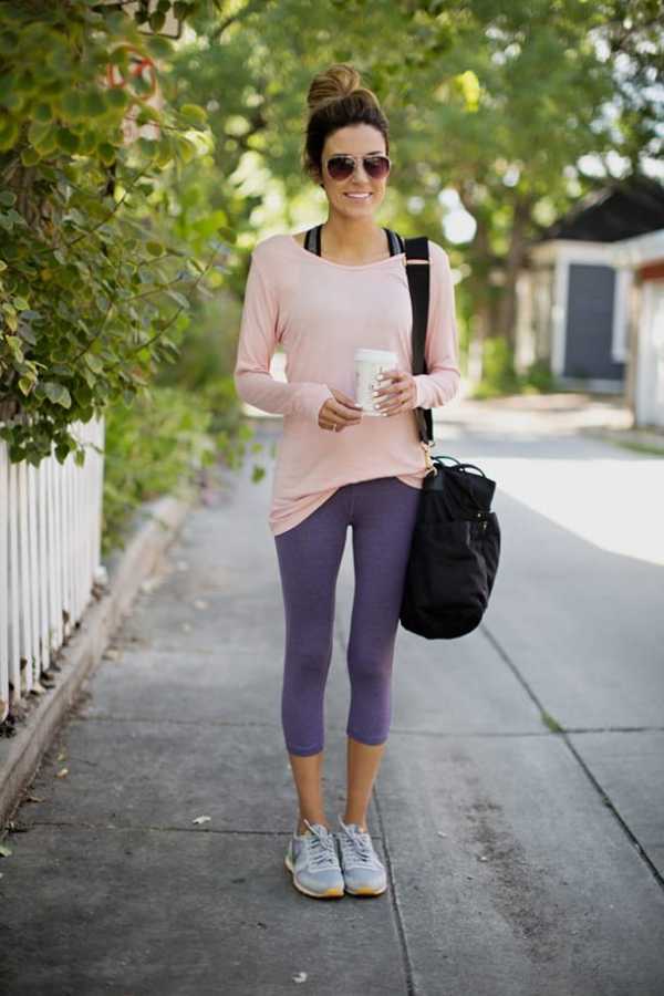 Идеальный комплект будет из узких облегающих вещей или моделей свободного покроя. Таким образом, не будет создаваться ощущение, что сейчас нужно отправляться на тренировку. К примеру, удачным сочетанием является водолазка с широкими брюками или просторная майка с легинсами.
