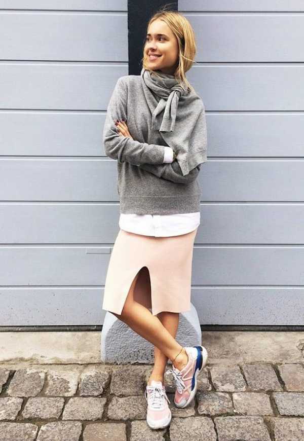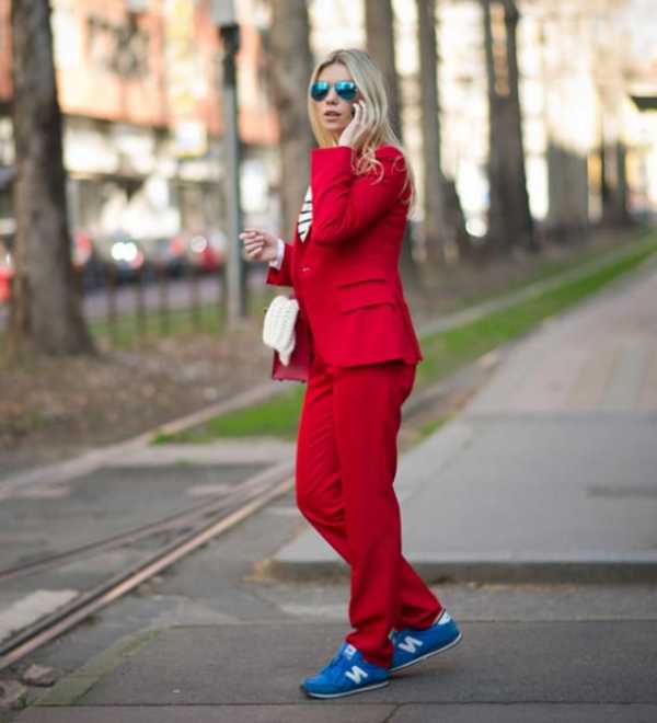 - Деловой sport-chic — микс офисной одежды с одеждой для активного образа жизни: блейзер, юбка-карандаш плюс яркий топ и слипоны.
