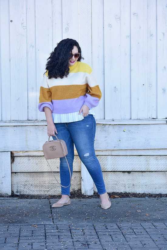 Модные осенние образы для полных женщин 2019-2020 сегодня не представляются без любимых всеми и универсальных джинсов. Избегать лучше декора, клеша и пониженной талии в джинсах для полных девушек.
