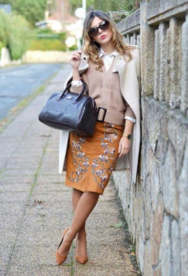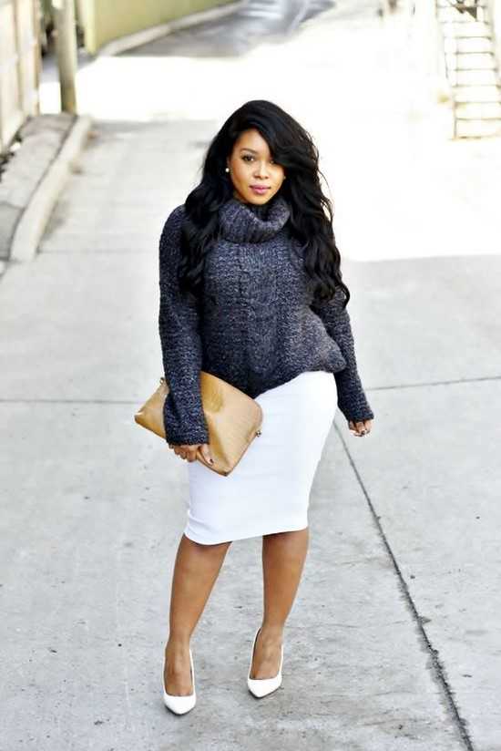 Не стоит забывать и о юбке карандаш, с которой осенние образы для полных женщин выглядят очень элегантно и нарядно. Юбки миди – самый оптимальный вариант для любой фигуры плюс сайз.