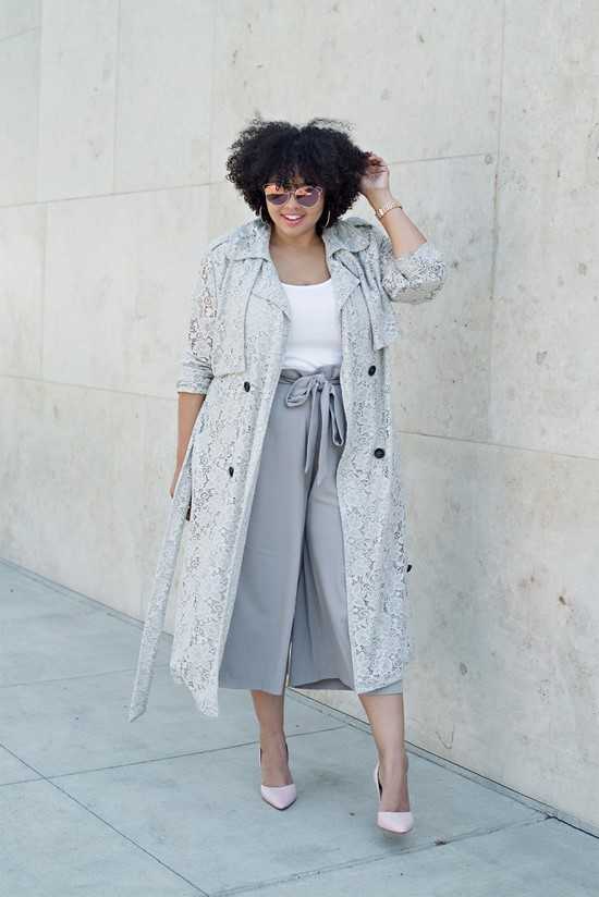 Из всех видов верхней одежды на осень в образах для полных женщин эффектней и гармоничней смотрится удлиненное пальто и легкий тренч. Аккуратно скрывая полноту бедер и лишние сантиметры в талии, подобная верхняя одежда идеально подходит для полных женщин.