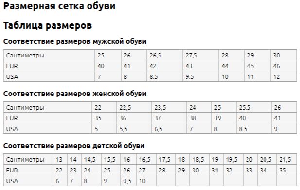 Важно! При заказе обуви на сайте магазина убедитесь, что у производителя этой модели нет своей собственной размерной сетки.