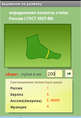 Следующим этапом является определение значения по специальной таблице полноты обуви, учитывая страну-производителя. В России полнота определяется по ГОСТу 3927-88, маркировка показывается цифрами с шагом в 4 мм. Для европейских производителей используется схожая маркировка, но шаг между отдельными значениями полноты составляет 5 мм, для Англии применяется буквенное обозначение, но с тем же интервалом. Для США полнота определяется буквенной маркировкой, но применяются удвоения и утроения букв, обозначающие очень широкие или очень узкие ноги.