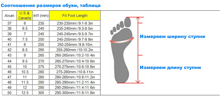 После проведения измерений вы получили длину ноги в сантиметрах. При помощи специальной таблицы вы легко сможете перевести его в американский размер мужской обуви.