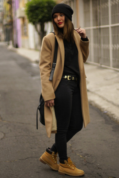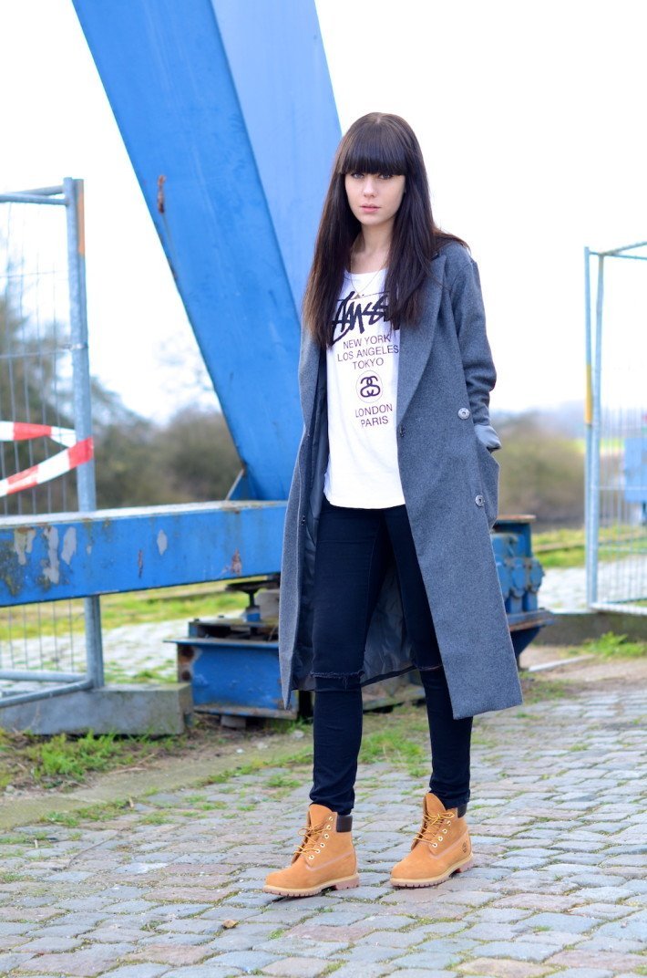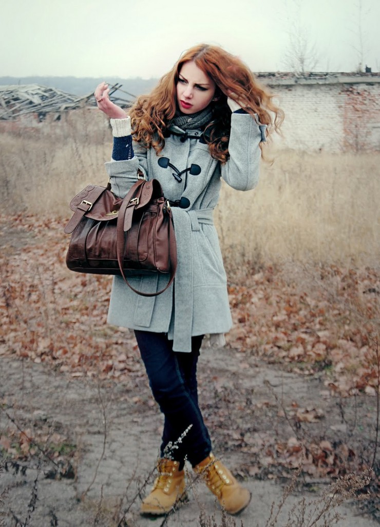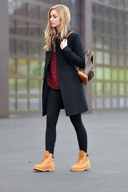 Тимберленды в сочетании с серым или черным пальто, длиной немного ниже колена будут смотреться очень интересно. Зимние ботинки, утепленные натуральной овчиной, не позволят мерзнуть ногам.