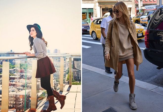 С короткими юбками и платьями «тимберленды» тоже смотрятся неплохо. Составляя образ, можно, например, попробовать подчеркнуть воздушность материала платья, для контраста надев эти грубоватые ботинки. Интересными получаются и комплекты с совсем короткими прямыми юбками и объёмным верхом. Однако юбку или платье для образов с «тимбами» стоит выбирать внимательно. С ними будут хорошо смотреться более расслабленные, немного небрежные вещи, например, близкие стилю бохо, или образы с андеграундной ноткой. Для строгих линий классики или женственного ретро лучше подобрать другую обувь.
