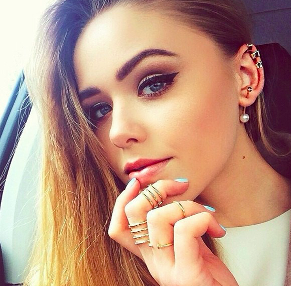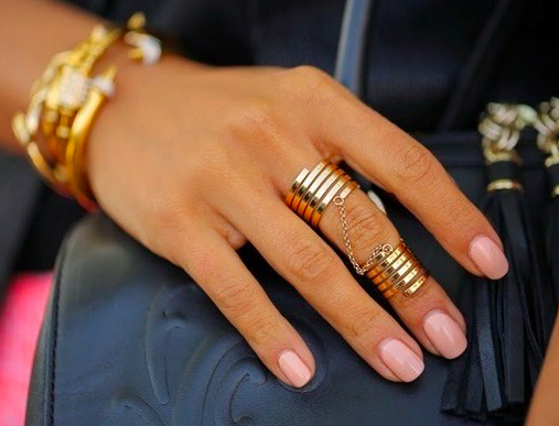 Кольца обязательно должны быть в большом количестве, двойные или тройные, с камнями и цепочками.