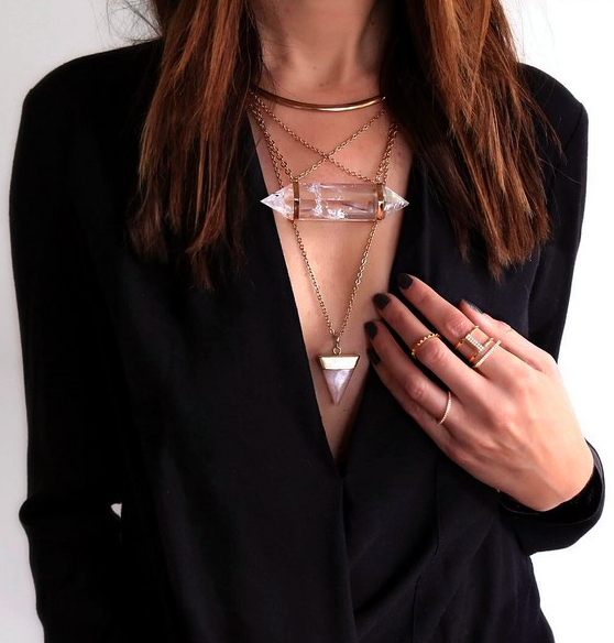 - массивное колье на шее смотрится ярко и является центральным элементом образа, поэтому дополнять его другими видами бижутерии — браслетами, кольцами и крупными серьгами, не рекомендуется;