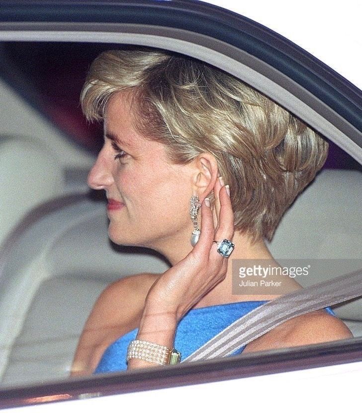 Еще одна драгоценность, которая ранее принадлежала королевской семье — роскошное кольцо с огромным аквамарином. Правда, его в отличие от тиары Диана получила после развода. Она часто носила его на безымянном пальце вместо помолвочного или обручального. После ее гибели его унаследовал принц Гарри — и подарил своей будущей супруге Меган Маркл, которая надела его на свадебную церемонию.
