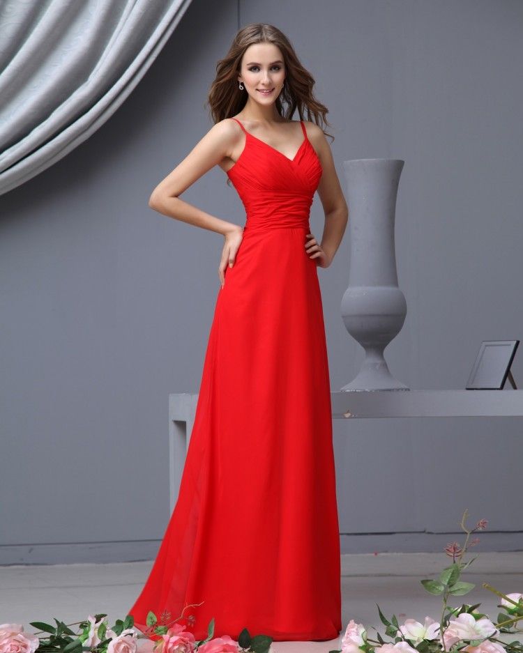 Стоит женщина в длинном красном платье, фотомодель в вечернем платье парит над морем.