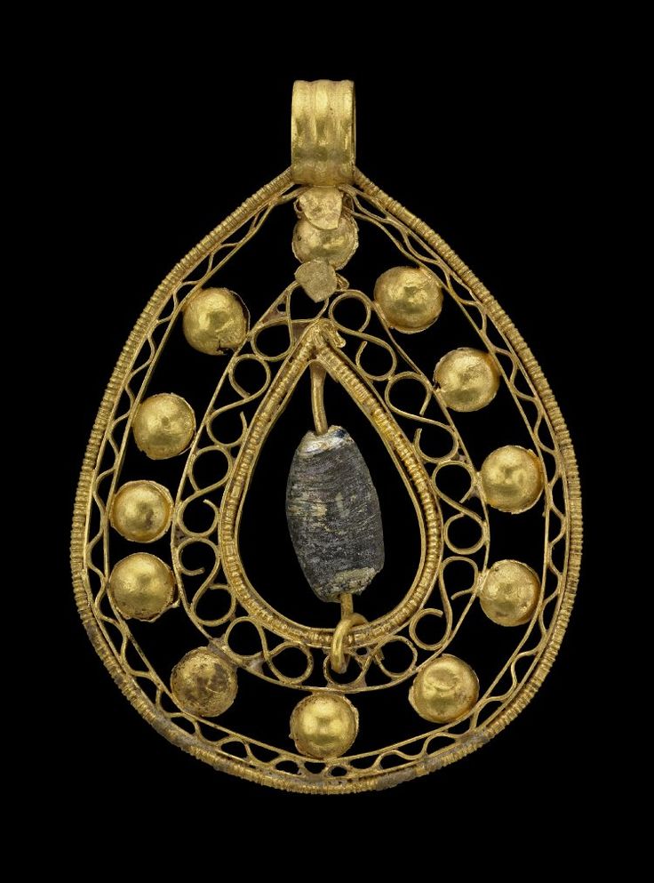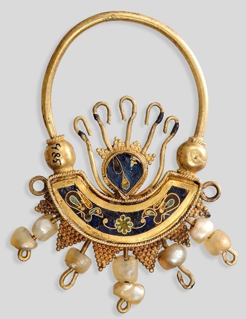 (слева) Золотая серьга в форме полумесяца с павлинами. 6-7 век. Золото | (в центре) Золотое ожерелье с жемчугом и камнями изумрудной плазмы. 6-7 век. Золото, жемчуг, изумрудная плазма | (справа) Подвеска в форме полумесяца с птицами, столкнувшимися лицом к лицу. 11 век. Золото, перегородчатая эмаль, бирюза; филигрань. Фото через MetMuseum.org