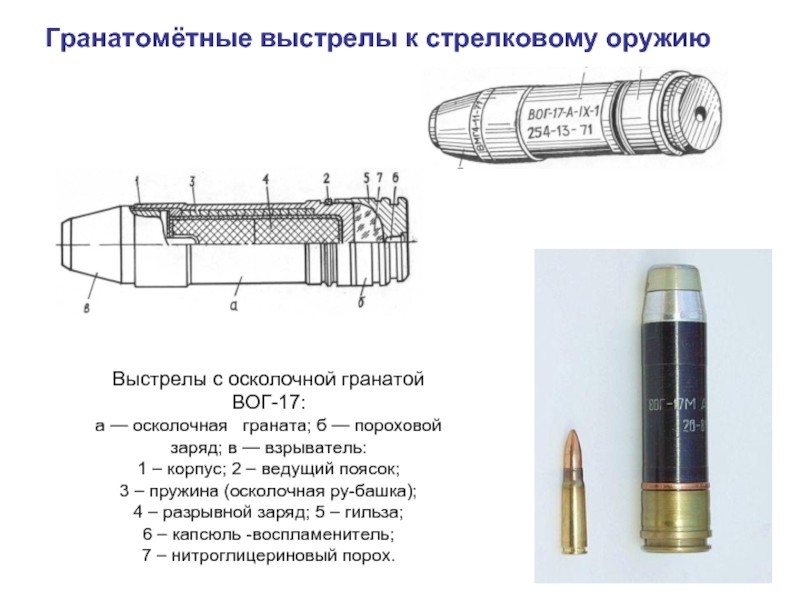 Гранатометные выстрелы ВОГи состоят из трех основных частей: ВМД-М (взрыватель многозвенного действия модифицированный), осколочный корпус (у ВОГ-17-осколочная рубашка из проволоки с полуготовыми элементам) внутри которого находится взрывчатое вещество, гильза с пороховым зарядом.