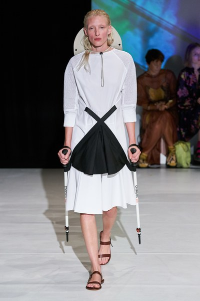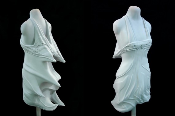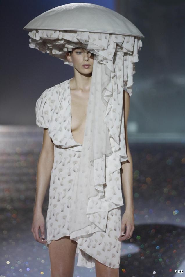 «Ее одежда исследует мифологию, символизм, суеверия или культурные верования. Но кто бы мог носить это моторизованное платье, состоящее из плавников, которые раскрываются по бокам, открывая шлейф из розового тюля? «