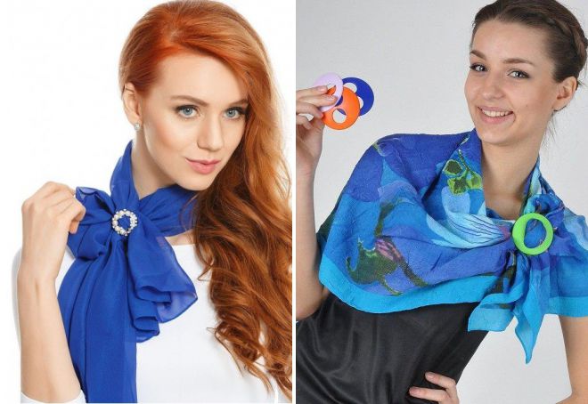 Необычный способ выполняется с использованием дополнительных деталей. Чтобы платок выглядел оригинально, потребуется металлическая или пластмассовая пряжка в виде восьмерки или кольца.