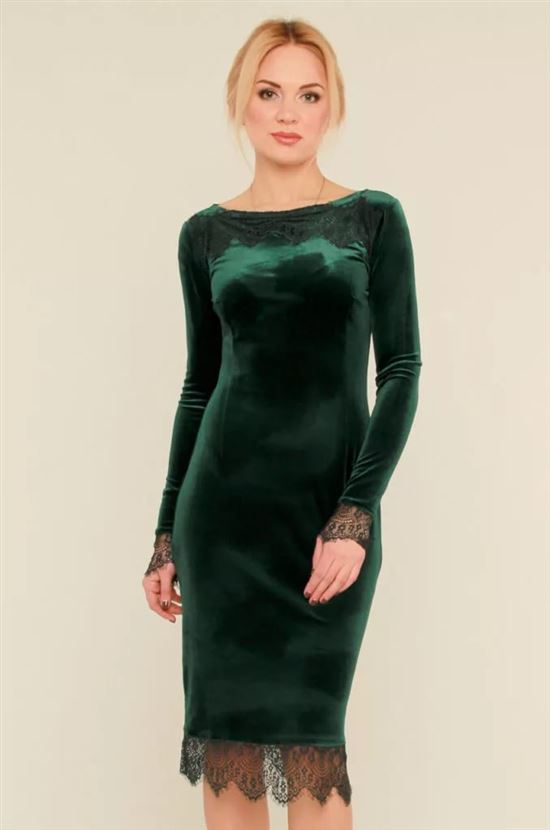 Бархатное платье с кружевом по низу и брошью, зеленое — купить в Москве ◈ цена в интернет-магазине «L’Marka»- Характеристики