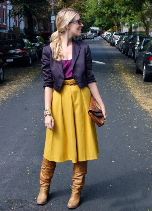 Желтую плиссированную юбку до колена выбрала для уличного лука Тейлор Свифт. А дополнить образ певица решилась темно-синим джемпером и яркими красными туфлями. Это смелое сочетание сразу же привлекло внимание поклонников звезды, а многие модницы взяли подобный лук на вооружение.