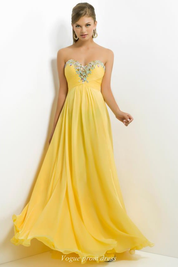 - Отличным вариантом также станет желтое платье на выпускной вечер. Струящийся наряд в пол из атласного шелка, шифона или гипюра привлечет к своей обладательнице восторженные взгляды окружающих и сделает ее центром всеобщего внимания.