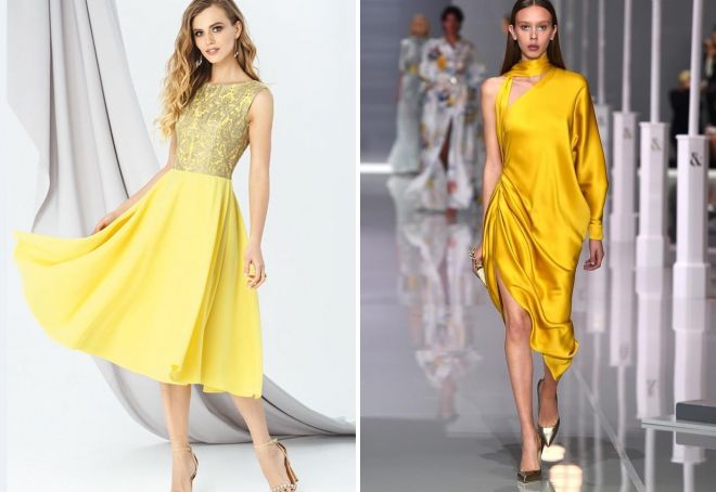 - Расклешенные желтые платья и модели с пышной юбкой,