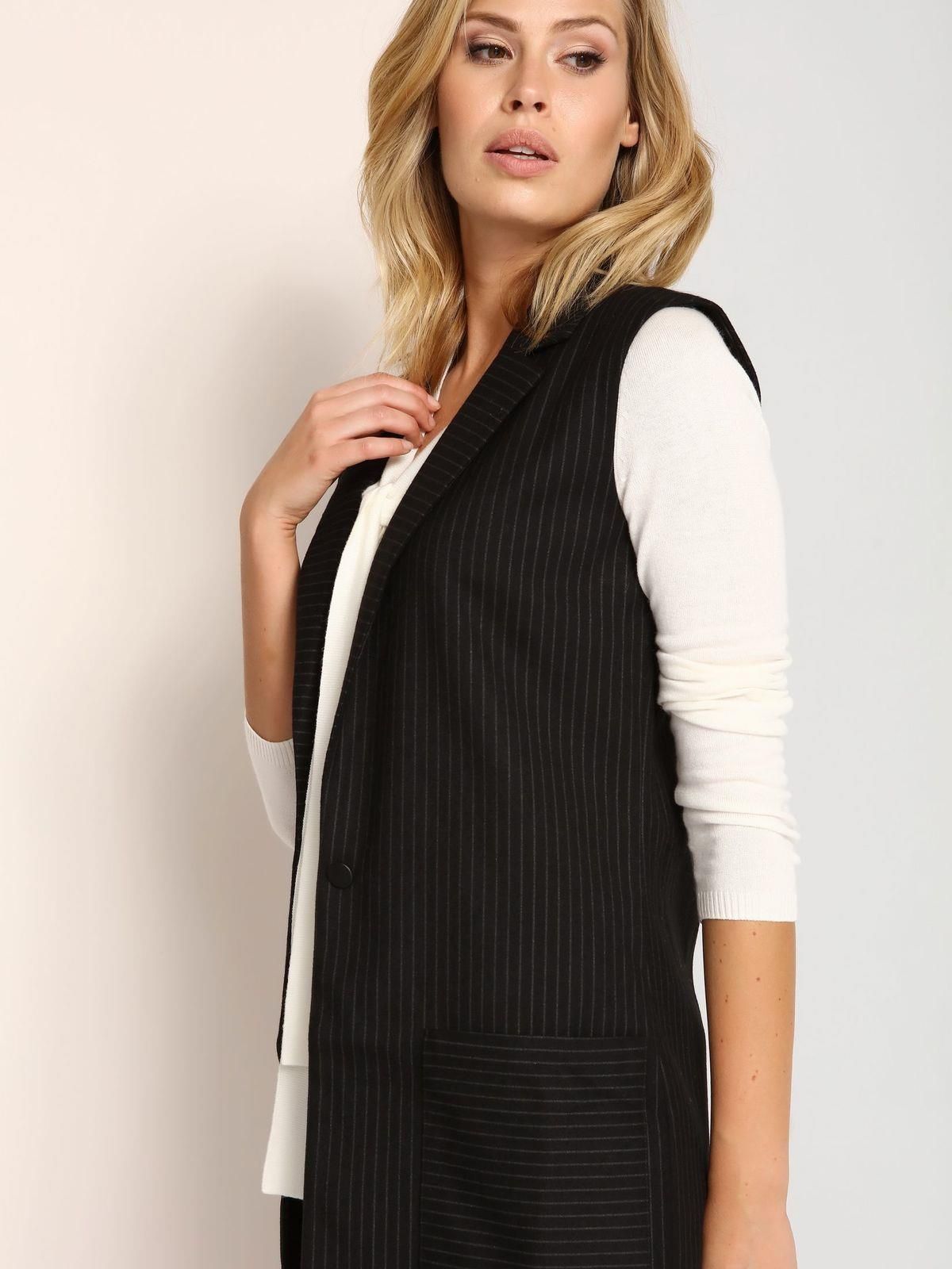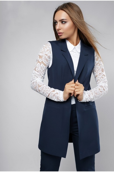 Длинные модели иногда можно использовать в качестве верхней одежды в прохладный день. Удлиненная жилетка отлично комплектуются с тонким джемпером или облегающей водолазкой. Внешне такой жилет напоминает, скорее, легкое пальто или плащ. Прекрасно комбинируется с узкими джинсами, широкими юбками в пол, короткими шортами и т.д.