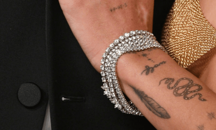 Как видите, Кравиц большая поклонница изящных татуировок, что делает ее руки идеальным холстом. На обеих руках у нее есть одиночные листья, сделанные доктором Ву в 2016 году. На среднем пальце правой руки у нее есть контур короны. На обоих средних пальцах у нее полумесяцы с декоративными точками. На кончиках ее пальцев написано «Лола Вульф» с точками над каждой буквой. Это еще один символ в честь двух ее сводных братьев и сестер.