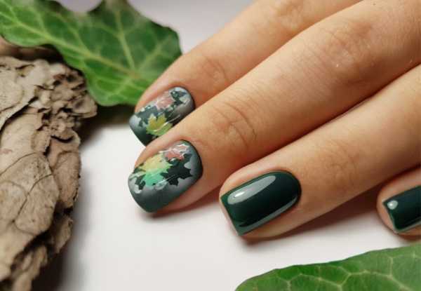 В приоритете приглушенные цвета и минимализм в оформлении. Но если хочется добавить в маникюр изысканное мерцание, можно украшать листочки модными золотыми блестками.