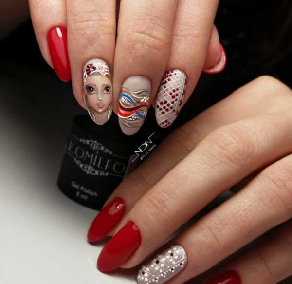 Но самым красивым и утонченным рисунком в маникюре осень-зима остается изображение лица девушки. Сложный по технике, зато удивительный и мегастильный дизайн с рисунком женского личика заслуживает попасть на ваши ноготки этой осенью или зимой.