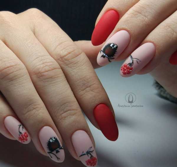 Забавные птички (пухленькие снегири и сонные совы) на ногтях выглядят очень привлекательно и мило в осенне-зимнем дизайне маникюра 2019-2020.