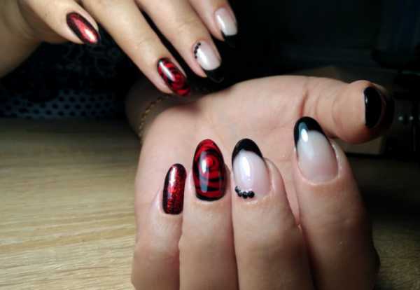 Многообразие вариантов красного маникюра не перестает удивлять. Это и французский маникюр и лунный маникюр. Красивое сочетание красного цвета с черным или с серебристым цветами.