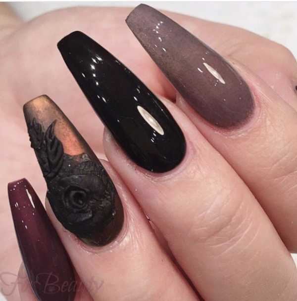 Несмотря на явное преимущество холодных темных и ярких теплых тонов, осенью 2019 не стоит сбрасывать со счетов серые, дымчато-болотные, оливковые, фиолетовые и приглушенные зеленые оттенки. Невозможно не отметить триумфальное возвращение в тренды черного лака. Маникюр с ним в главной роли сегодня отличается аристократичностью, лаконичностью и минимализмом. Можно даже ограничиться однотонным черным покрытием без компромиссов, но выразительный будет смотреться сочетание с росписью или вкраплениями глиттера.