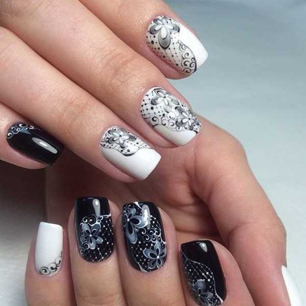 Эксперты заявляют, что черно-белый маникюр снова в моде. Сочетание белого с черным вносит в образ дамы некий шарм, стиль и обаяние. Деликатные узоры и строгие линии очень гармонично сочетаются в этих классических цветах.