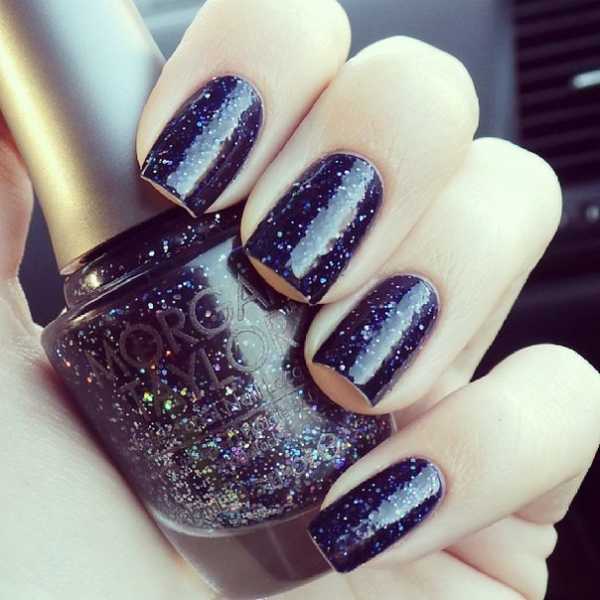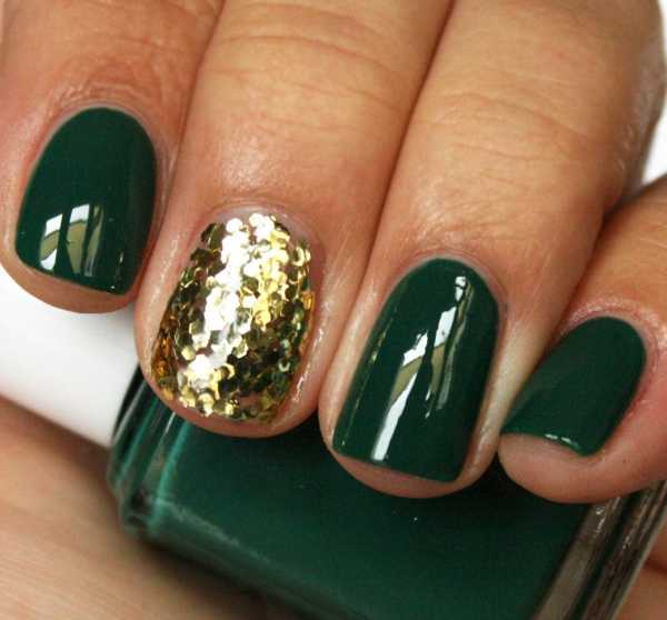 Матовый однотонный маникюр темным шеллаком уже сам по себе хорош, но если вы хотите сделать его более живым и интересным, попробуйте выделить акцентные пальчики. Вы можете сделать это с помощью художественной росписи, стразов, блесток, скотч-ленты, микробисера или объемных рисунков акриловой пудрой – решение за вами. Можно поступить еще проще, и использовать на акцентных пальчиках глянцевый шеллак в тон основному.