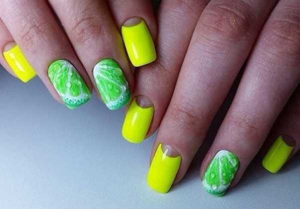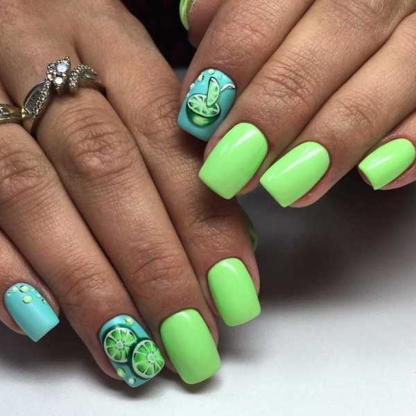 Летний период позволяет внести в ассортимент цветов сочные и яркие оттенки. На ногтях можно отразит синеву неба или зелень молодой травы. Также в топе различные цвета, связанные с фруктами. Например, рисунок кожуры арбуза, лимонной дольки или киви в разрезе. Кроме этого интересно и оригинально выглядят мини-аппликации из полимерной глины. Из нее изготавливают забавные объемные фигурки: фрукты, жучки, бабочки, цветы, листья. Все это методы создания праздничного маникюра. На каждый день объемные творения нейл-индустрии не подойдут, так как просто будут ограничивать свою хозяйку в действиях.