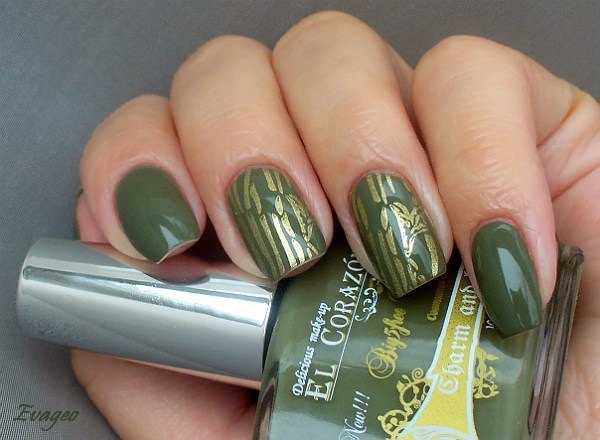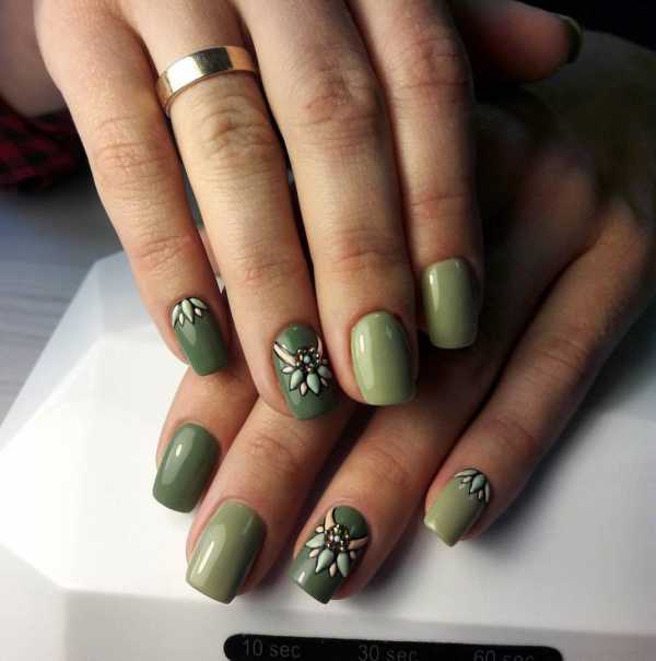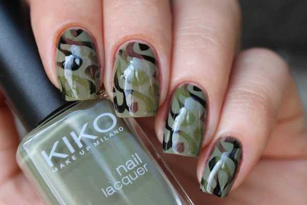 В топе многочисленные оттенки хаки. Они варьируются от бледно-песочного до буро-зеленого. Альтернативой хаки выступит оливковый цвет. Такие тона принято разбавлять мелкими блестящими пигментами. Блеск может быть серебряным или иметь оттенок по желанию обладательницы маникюра. Интересно выглядит камуфляж на ногтях. Нарисовать его сможет искусный мастер. Если ловкости и навыков не хватает, то можно использовать наклейки и штампы. Такой маникюр будет выглядеть в меру брутально и при этом сохранять сексуальность и женское очарование.
