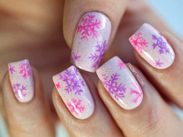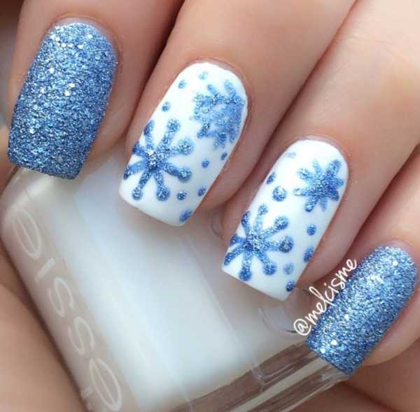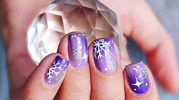 Начало года приходится на зимний период. В это время актуальными будут разновидности оформления с новогодней или просто зимней тематикой. Снежинки на ногтевой пластине выглядят нежно и трогательно. Качественный узор поможет создать и продлить праздничное настроение. Для такого дизайна подойдет шеллак белого цвета, оттенков синего, фиолетового, серого, разнообразные блестящие элементы и серебряные частицы. Дополнить узор можно стразами и мелкими бусинами. Один из модных вариантов – нанести на ноготь темный фон, на котором светлыми оттенками будут нарисованы снежинки.