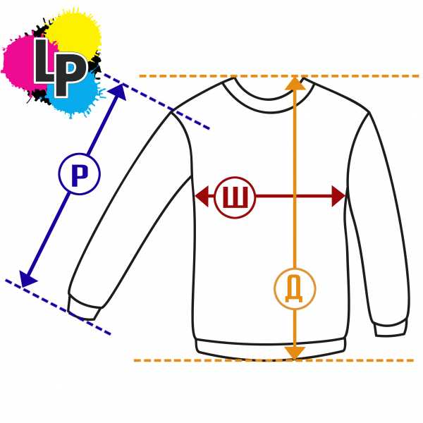 - Есть детские и взрослые свитшоты. Размерная линейка для взрослых – от XS до XXL, а для детей – от 32 до 40 размера (5-12 лет). Чтобы вам было проще разобраться, мы добавили таблицу с мерками и схему.